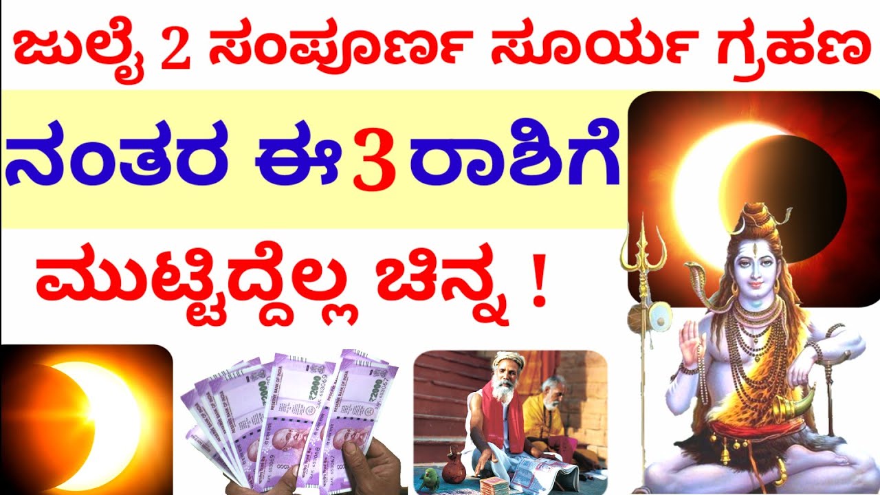 2019 ಜುಲೈ2 ಸಂಪೂರ್ಣ ಸೂರ್ಯ ಗ್ರಹಣ ನಡೆಯಲಿದೆ ಸೂರ್ಯಗ್ರಹಣದ ವೇಳೆ ಯಾರು ಏನು ಮಾಡಬೇಕು ಹಾಗೂ ಕೆಲಸ ಕಾರ್ಯಗಳು ಮಾಡದೇ ಇದ್ದರೆ ಒಳ್ಳೆಯದು ಹೀಗೆ ಎಲ್ಲ ಮಾಹಿತಿಯ ಬಗ್ಗೆ ಈ ಮೇಲಿನ ವಿಡಿಯೋ ನಲ್ಲಿ ಸಂಪೂರ್ಣವಾಗಿ ಮಾಹಿತಿಯನ್ನು ಹೇಳಿದ್ದೇನೆ. ಸೂರ್ಯ ಗ್ರಹಣ ಮುಗಿದನಂತರ 3 ರಾಶಿಯವರಿಗೆ ಅದೃಷ್ಟ ಬಲಿದು ಬರಲಿದ್ದು ಅವರು ಮುಟ್ಟಿದ್ದೆಲ್ಲ ಚಿನ್ನ ಅಂದರೆ ಅವರು ಮುಂದೆ ಮಾಡುವ ಎಲ್ಲ ಕೆಲಸಗಳು ಕೂಡ ತುಂಬಾ ಸುಲಭವಾಗಿ ಯಶಸ್ಸನ್ನು ಕಾಣುತ್ತದೆ. ಸಂಪೂರ್ಣ ಸೂರ್ಯ ಗ್ರಹಣ ಇದೇ ವರ್ಷ ಇದೇ ತಿಂಗಳು ಜುಲೈ 2 ನೇ ತಾರೀಖಿನಂದು ನಡೆಯಲಿದ್ದು ಯಾವ ಯಾವ ರಾಶಿಗಳಿಗೆ ಯಾವ ರೀತಿ ಅದೃಷ್ಟ ಬರುತ್ತದೆ ಎಂಬುದನ್ನು ಈ ಮೇಲಿನ ವಿಡಿಯೋದಲ್ಲಿ ಸಂಪೂರ್ಣವಾಗಿ ತಿಳಿಸಿದ್ದೇನೆ. ಸೂರ್ಯ ಗ್ರಹಣದ ನಂತರ ಈ 3 ರಾಶಿಯವರಿಗೆ ಸೂರ್ಯಗ್ರಹಣದ ನಂತರ ಅದೃಷ್ಟ ಒಲಿಯಲಿದೆ.ಹಾಗಾಗಿ ಜುಲೈ 2ರಂದು ಸಂಪೂರ್ಣ ಸೂರ್ಯ ಗ್ರಹಣ ನಡೆಯಲಿದ್ದು ಮೇಷ ರಾಶಿ ವೃಷಭ ರಾಶಿ ಧನಸ್ಸು ರಾಶಿ ಈ ಮೂರು ರಾಶಿಗೆ ತುಂಬಾ ಅದೃಷ್ಟ ಒಲಿದು ಬರುತ್ತದೆ.ಇವರು ಇನ್ನು ಮುಂದೆ ಮುಟ್ಟಿದ್ದೆಲ್ಲ ಚಿನ್ನ ಆಗುವಂತೆ ಇವರು ಮಾಡುವ ಎಲ್ಲ ಕೆಲಸಗಳು ಖಂಡಿತವಾಗಿಯೂ ಕೂಡ ಯಶಸ್ಸನ್ನು ಕಾಣುತ್ತದೆ ಎಂದು ಶಾಸ್ತ್ರಗಳು ತಿಳಿಸಿಕೊಡುತ್ತದೆ. A complete eclipse will take place on July 2, 2019. Whoever does the eclipse and does not do the job is good.Once the eclipse is over, the three piles of luck will come and they have touched the gold.In the video above, I have fully told you which fate the full eclipse will take place on the 2nd of July of the same year.After the eclipse, these 3 piles will have good luck after the eclipse.So, on July 2, a total solar eclipse will take place. Aries Taurus Shastras tell him that all his work will surely be a success, as he has no longer touched the gold.