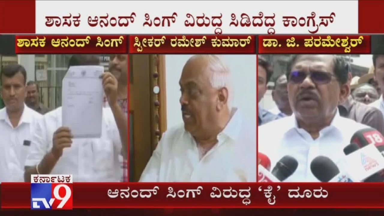 Congress Counters Rebel MLA Anand Singh. KPCC Leaders Approach Speaker Against Singh. Cong Leaders Parameshwara, Eshwar Khandre & Others Meet Speaker. Cong Leaders Seek Clarification Over Singh's Resignation. Singh Has Resigned From His MLA Post but Not From Party (ಸ್ಪೀಕರ್ ಗೆ ‘ಕೈ’ ದೂರು) ಆನಂದ್ ಸಿಂಗ್ ವಿರುದ್ಧ ಸಮರ ಸಾರಿದ ಕಾಂಗ್ರೆಸ್- ರಾಜೀನಾಮೆ ವಿರುದ್ಧ ಸ್ಪೀಕರ್ ಗೆ ದೂರು- ಪರಮೇಶ್ವರ್, ಖಂಡ್ರೆ ನೇತೃತ್ವದಲ್ಲಿ ರಮೇಶ್ ಕುಮಾರ್ ಭೇಟಿ